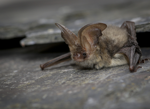 The brown long-eared bat is known as the 'whispering bat', because its voice is very quiet - no need to shout when you have such big ears! While at rest, it tends to either curl its ears back or tuck them under its wings.