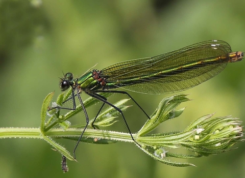 The Banded demoiselle can be seen flitting around slow-moving rivers, ponds and lakes. The males are metallic blue, with a distinctive dark band across their wings, and the females are a shiny green.