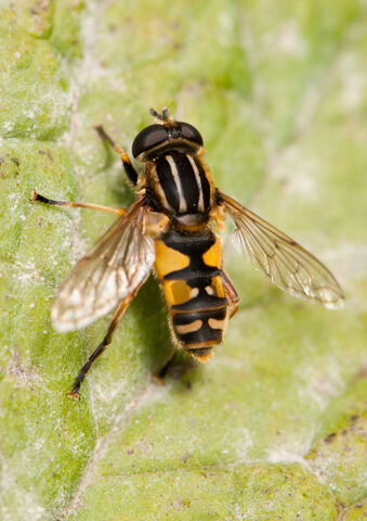 The footballer takes its name from the black and yellow stripes on its thorax, a pattern that is often used on football shirts. It's sometimes also called the common tiger hoverfly.It is common across the UK in a wide variety of habitats, from woodlands to gardens and roadsides. It can often be seen visiting flowers on sunny days. The footballer is particularly fond of damp areas, as its young (larvae) live in shallow water with lots of rotting vegetation, or in very wet manure. They are known as rat-tailed maggots because of their long 'tail', which is actually a breathing tube.